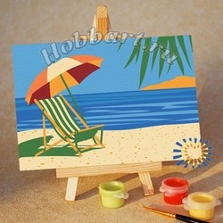 Состав набора: загрунтованный хлопковый холст с контурным рисунком (наклеен на картонную основу) размером 10х15см; водно-дисперсионные (акриловые) краски, не требующие смешивания, в герметичных тубах; пустые пластиковые баночки для выдавливания краски; наклейки с номерами для пустых баночек; одна нейлоновая кисть; деревянный мини-мольберт для готовой работы.