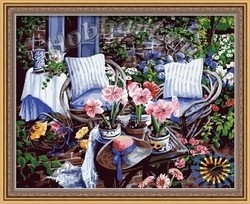 Состав набора: загрунтованный хлопковый холст с контурным рисунком закреплен на деревянном подрамнике размером 40х50см; водно-дисперсионные (акриловые) краски, не требующие смешивания, в герметичных тубах; пустые пластиковые баночки для выдавливания краски; наклейки с номерами для пустых баночек; комплект кистей; чёрно-белая инструкция (повторяет контурный рисунок на холсте); цветная инструкция (репродукция картины); инструкция с рекомендациями по использованию набора; металлические части крепления для подвешивания картины.