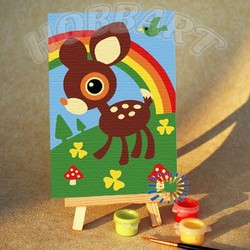 Состав набора: загрунтованный хлопковый холст с контурным рисунком (наклеен на картонную основу) размером 10х15см; водно-дисперсионные (акриловые) краски, не требующие смешивания, в герметичных тубах; одна нейлоновая кисть; деревянный мини-мольберт для готовой работы.