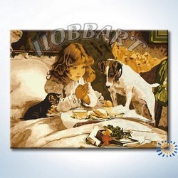 Состав набора: холст с нанесенным контурным рисунком, комплект акриловых красок, нейлоновые кисти, черно-белый контрольный лист.