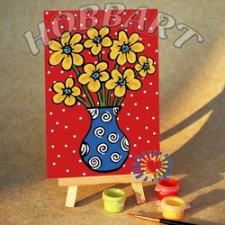 Состав набора: загрунтованный хлопковый холст с контурным рисунком (наклеен на картонную основу) размером 10х15см; водно-дисперсионные (акриловые) краски, не требующие смешивания, в герметичных тубах; пустые пластиковые баночки для выдавливания краски; наклейки с номерами для пустых баночек; одна нейлоновая кисть; деревянный мини-мольберт для готовой работы.