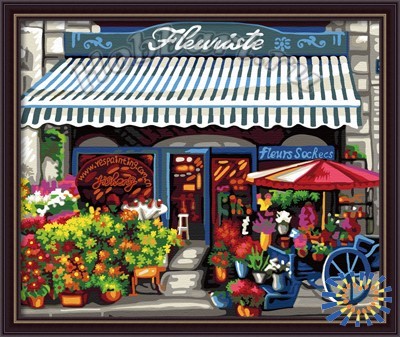 Состав набора: загрунтованный хлопковый холст с контурным рисунком закреплен на деревянном подрамнике размером 40х50см; водно-дисперсионные (акриловые) краски, не требующие смешивания, в герметичных тубах; пустые пластиковые баночки для выдавливания краски; наклейки с номерами для пустых баночек; комплект кистей; чёрно-белая инструкция (повторяет контурный рисунок на холсте); цветная инструкция (репродукция картины); инструкция с рекомендациями по использованию набора; металлические части крепления для подвешивания картины.