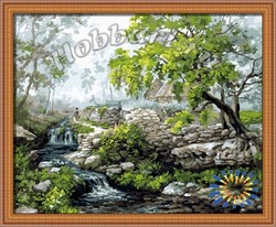 Состав набора: загрунтованный хлопковый холст с контурным рисунком закреплен на деревянном подрамнике размером 40х50см; водно-дисперсионные (акриловые) краски, не требующие смешивания, в герметичных тубах; пустые пластиковые баночки для выдавливания краски; наклейки с номерами для пустых баночек; комплект кистей; чёрно-белая инструкция (повторяет контурный рисунок на холсте); цветная инструкция (репродукция картины); инструкция с рекомендациями по использованию набора; металлические части крепления для подвешивания картины.