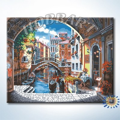 Состав набора: загрунтованный хлопковый холст с контурным рисунком закреплен на деревянном подрамнике размером 40х50см; водно-дисперсионные (акриловые) краски, не требующие смешивания, в герметичных тубах; пустые пластиковые баночки для выдавливания краски; наклейки с номерами для пустых баночек; комплект кистей; чёрно-белая инструкция (повторяет контурный рисунок на холсте); цветная инструкция (репродукция картины); инструкция с рекомендациями по использованию набора; металлические части крепления для подвешивания картины.