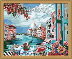 Состав набора: загрунтованный хлопковый холст с контурным рисунком закреплен на деревянном подрамнике размером 40х50см; водно-дисперсионные (акриловые) краски, не требующие смешивания, в герметичных тубах; пустые пластиковые баночки для выдавливания краски; наклейки с номерами для пустых баночек; комплект кистей; чёрно-белая инструкция (повторяет контурный рисунок на холсте); цветная инструкция (репродукция картины); инструкция с рекомендациями по использованию набора; металлические части крепления для подвешивания картины.